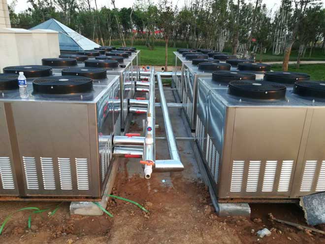 近年來,空氣源熱泵作為太陽能加熱輔助系統,越來越多的與太陽能相結合,為泳池系統提供熱源。空氣能泳池恒溫機組利用制冷劑作介質,輸入少量的電能,吸收空氣中的熱能,產生熱水。制冷劑汽化溫度低,在-40℃即可汽化,故它與外界溫度存在溫差,冷媒在蒸發器內吸收外界溫度后汽化成為低溫低壓的氣體,通過壓縮機壓縮變成高溫高壓氣體,再經冷凝器與水交換熱量后,被冷凝成液體,經電子膨脹閥節流降壓后變成低溫低壓的液態,然后在蒸發器中吸收空氣中的熱量后繼續被壓縮機吸入,不斷循環,制取熱水,維持泳池的恒溫。