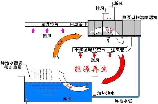由于上面提到的這些問題,目前在市面上興起很多專門針對室內(nèi)泳池開發(fā)的恒溫恒濕熱泵。一種為常規(guī)的空氣源熱泵,只提供池水的加熱,還有一種能將除濕、空調(diào)、加熱等功能集合于一體,其工作原理簡言之,即是將池水表面蒸發(fā)熱損(包括濕熱和潛熱)回收利用,轉(zhuǎn)移入池水和空氣中,彌補池水和空氣熱損,同時實現(xiàn)空氣調(diào)節(jié)除濕功能,當春秋的過渡季節(jié)時,(空氣溫度在15℃~26℃,相對濕度小于60%),設備運行全新風模式,此時,只有熱泵的通風機在工作,這種狀態(tài)下,熱泵的技能優(yōu)勢是顯而易見的。但在冬季,除濕熱泵的運用卻面臨制熱不足的問題。