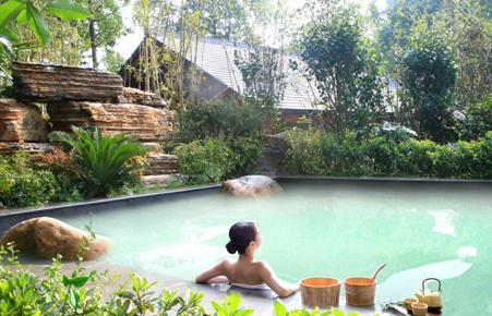 從室內(nèi)的藥池出來(lái),到室外的露天池,商家對(duì)池水的溫度進(jìn)行了科學(xué)調(diào)控,有多種不同水溫的池子,剛從池水中出來(lái),在秋夜的寒氣中感覺很冷,找了一個(gè)水溫較高的池子泡著,這個(gè)池子不大,只能容納十來(lái)個(gè)人。四周移栽有翠竹和常青樹。水池的石階邊有兩個(gè)出水孔,上面人工制成考究的石兌,不仔細(xì)注意看還難以發(fā)現(xiàn),一個(gè)是地下溫泉,一個(gè)是地下冷泉,混合而成適合人體的水溫。池中的水總是流動(dòng)著,一點(diǎn)都不渾濁,清澈見底。人入池中便碧波蕩漾,在燈光下,能清楚看到自己的腳趾頭。乳白色熱氣繚繞著飄向空中,感覺就是人間仙境。