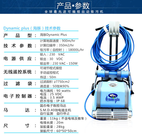 海豚2002全自動泳池吸污機采用帶過濾功能的吸污過濾袋,自動程式化工作,適用不同大小的泳池使用。休積細小,輕巧及操作容易。帶推車,便于使用及收藏。獨立設備,無需安裝。
